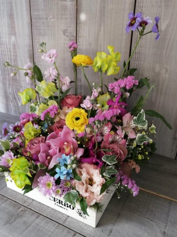 ・セルボオリジナルの木製ボックスにアレンジしたボックスフラワー。