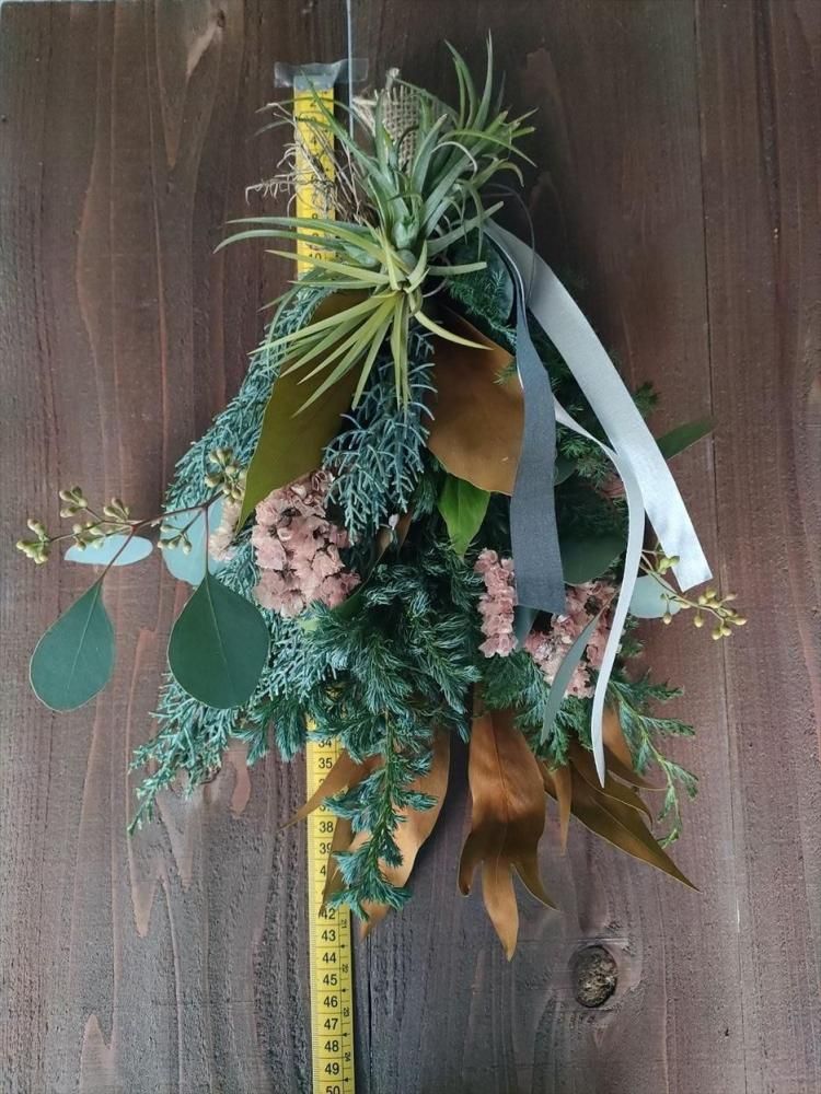 生花とエアプランツを組み合わせた、ナチュラルで長く楽しめるスワッグです。